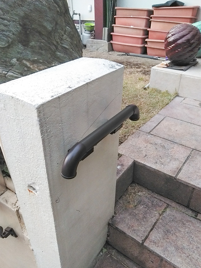 ・玄関ポーチの前にも段差があり、そこにも手すりを付けたい。壁に手を伝いながら歩くのは危険なので何とかしたい。